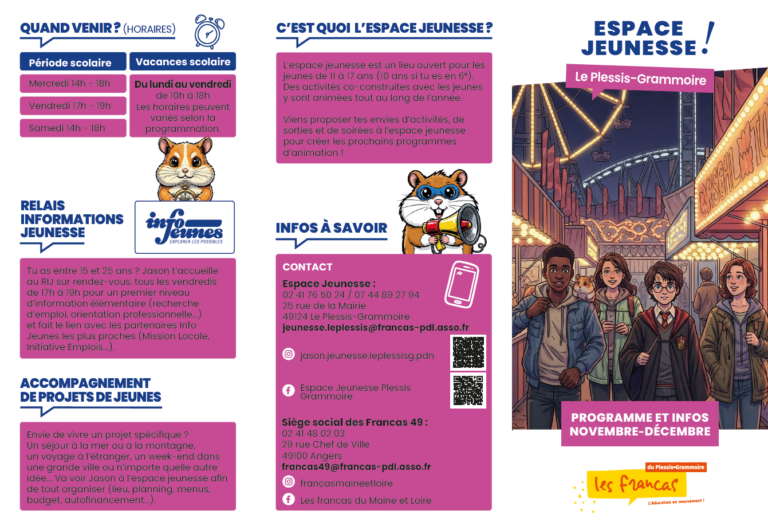 L’Espace Jeunesse dévoile son nouveau programme pour les mois de novembre et décembre 2025 !Au menu : des activités variées, des moments conviviaux et de belles sorties pour bien terminer...