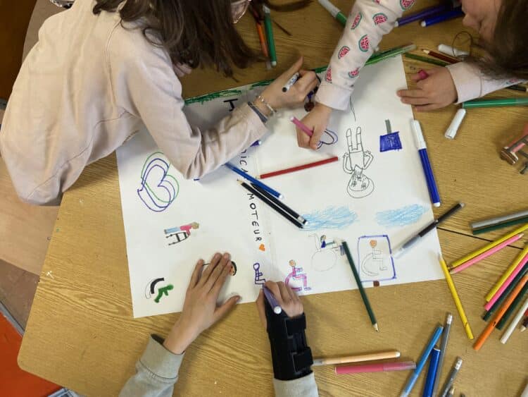 Notre intervention s’est finalisé le mercredi 22 mars. Pendant cette journée, nous avons demandé aux enfants de créer, en petits groupes, des affiches sur un handicap précis.