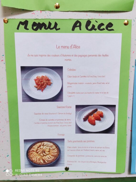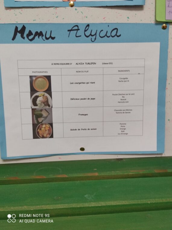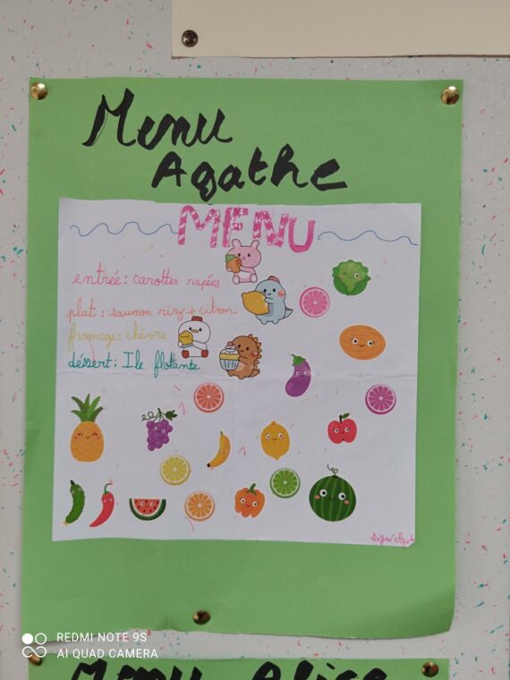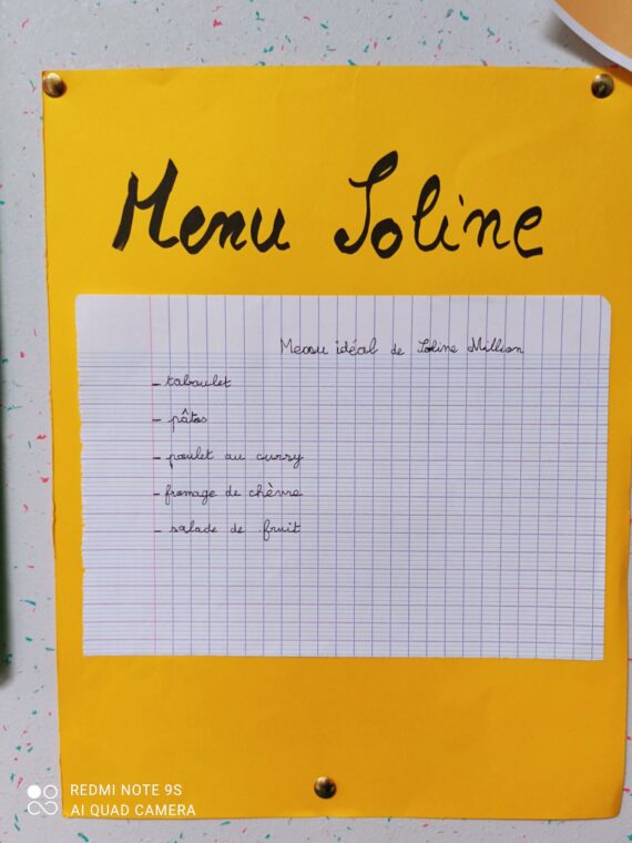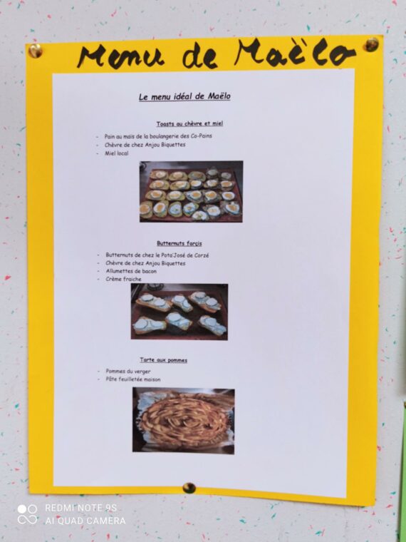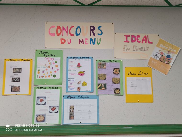 L’équipe d’animation des Francas du Maine-et-Loire a organisé un concours créatif et gourmand : le concours du menu idéal. Sept enfants de l’école André Moine ont relevé le défi avec enthousiasme et imagination. Leurs propositions de menus, aussi variées que savoureuses, ont été exposées dans la restaurant scolaire pour le plus grand plaisir de tous.